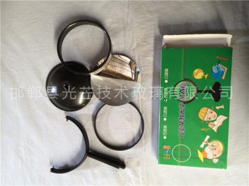 帶底座凹透鏡 直徑:10厘米 焦距:負(fù)300mm 幼兒園小朋友 或者中小學(xué)生認(rèn)識(shí)凹透鏡的特點(diǎn) 學(xué)習(xí)凹透鏡光學(xué)原理的的器材 尺寸大也時(shí)候教師教學(xué)演示用教具 知識(shí)拓展閱讀: 凸透鏡與凹透鏡可以從以下幾個(gè)方面加以區(qū)別:外形特征、對(duì)光線的作用、成像特點(diǎn)及用途等。具體方法如下: 方法一:用手摸,鏡子的中央部分比邊緣厚的是凸透鏡,鏡子的中央部分比邊緣薄的是凹透鏡。 方法二:隔著鏡子觀察距鏡子較近的書上的字,有放大作用的是凸透鏡;字變小的是凹透鏡。 方法三:隔著鏡子觀察距鏡子較近的書上的字,移動(dòng)鏡子,若發(fā)現(xiàn)像的移動(dòng)方向總是與鏡子的移動(dòng)方向相同,則該鏡子是凹透鏡;若發(fā)現(xiàn)像的移動(dòng)方向總是與鏡子的移動(dòng)方向相反,則該鏡子是凸透鏡。 方法四:隔著鏡子觀察窗外的物體,若能看到上下左右都顛倒的像,這種鏡子是凸透鏡;若看到像是正立的,這種鏡子是凹透鏡。 方法五:將點(diǎn)燃的蠟燭放在離透鏡適當(dāng)距離處,在另一側(cè)光屏上能得到倒立實(shí)像的是凸透鏡;無(wú)論怎樣調(diào)節(jié),在另一側(cè)光屏上不能得到像的是凹透鏡。 方法六:讓鏡子正對(duì)太陽(yáng)光照射,在鏡子的另一側(cè)放一張與透鏡平行的白色卡片紙,耐心調(diào)節(jié)鏡子與紙之間的距離,能得到一個(gè)小亮點(diǎn)的是凸透鏡;始終不能獲得小亮點(diǎn)的是凹透鏡。 方法七:觀察陽(yáng)光通過(guò)了兩副眼鏡在地面上形成的光斑,若形成光斑的中間比四周明亮,則鏡子是凸透鏡;若形成光斑的中間比四周暗,則鏡子是凹透鏡。 方法八:近視眼鏡,是用凹透鏡做成的。老花鏡,是用凸透鏡做成的。 說(shuō)明:辨別凸透鏡與凹透鏡有好多方法,哪種方法好,要視具體情況而定。例如,如果待辨別透鏡的中央與邊緣的厚薄差異不明顯,就不能用“摸”的方法(況且精密光學(xué)儀器是不允許直接用手去摸的);在有太陽(yáng)光與沒有太陽(yáng)光的場(chǎng)合,所選的方法也不同。總之,一種好方法,應(yīng)該簡(jiǎn)便、易行、有效。它是隨場(chǎng)合變化而變化的,不宜一概而論。 技巧:當(dāng)你想要判別兩件事物的相同和不同之處時(shí),就需要用比較與對(duì)比的方法。比較就是找出事物的相似性,即共同特征。對(duì)比是找出事物的不同點(diǎn)。用這種方法來(lái)分析事物,能幫助你發(fā)現(xiàn)一些平時(shí)容易忽略的細(xì)節(jié)。